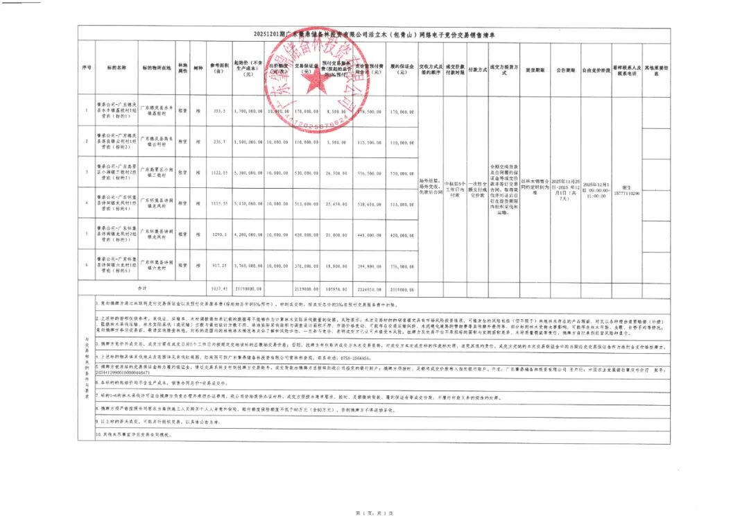 我公司定于2025年12月1日在广西数智林业有限公司林联网交易平台以网络电子竞价交易方式销售以下活立木一批,欢迎有意向者对标的进行实地查勘、竞标。(自由竞价时间为2025年12月1日9:00—11:00),倒计时阶段开始时间为2025年12月1日11:00,倒计时周期3分钟(180秒)。为不影响正常交易,请在竞价开始前交纳交易保证金及交易手续费。详情请关注广西数智林业有限公司林联网交易平台(www.forestryi.com)或微信小程序:林联网发布的活立木交易信息。